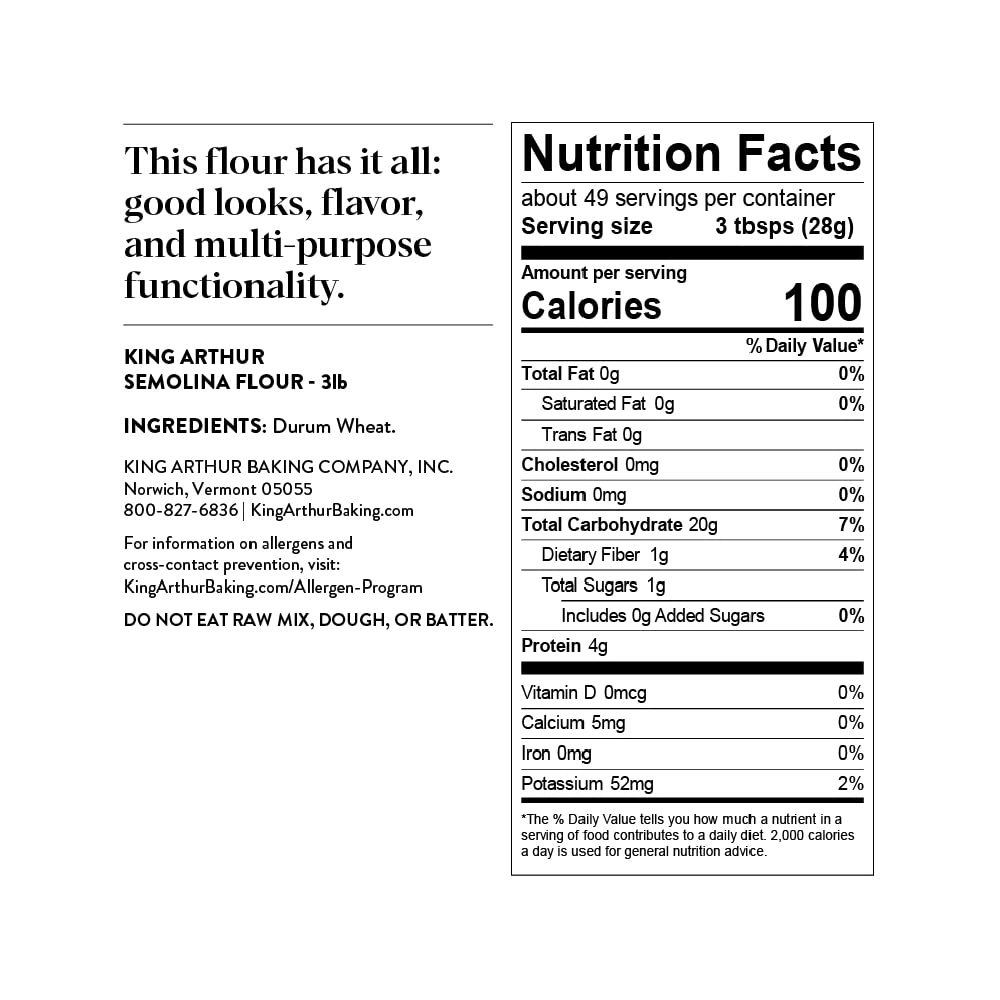 King Arthur Premium Semolina Flour: Coarse Ground, High Protein Durum Wheat for Perfect Pasta, Pizza, and Bread Making - Kosher, 3 lbs Resealable Bag, USA-Grown Wheat, Versatile Baking Ingredient